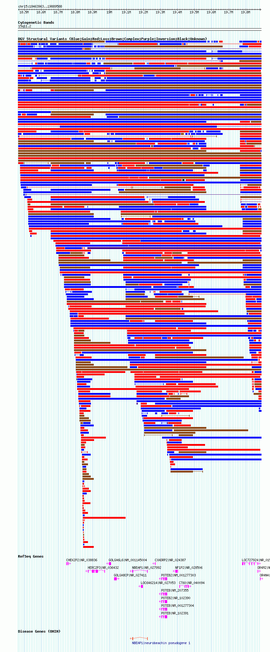 Variant DetailsVariant: dgv2190n100| Internal ID | 22788277 | | Landmark | | | Location Information | | | Cytoband | 15q11.1 | | Allele length | | Assembly | Allele length | | hg38 | 2101578 | | hg19 | 2184276 | | hg18 | 1425626 |