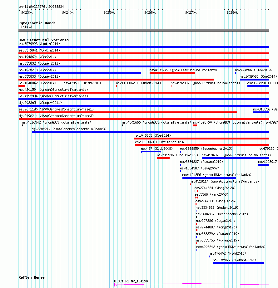 | Variant Type | CNV loss | Copy Number | | Allele State | | Allele Origin | | Probe Count | | Validation Flag | | Merged Status | M | Merged Variants | | Supporting Variants | esv3627194, esv3627196, esv3627193 | Samples | HG02561, HG00146 | Known Genes | DISC1FP1 | Method | Sequencing | Analysis | | Platform | Multiple platforms | Comments | | Reference | 1000_Genomes_Consortium_Phase_3 | Pubmed ID | 21293372 | Accession Number(s) | dgv219e214