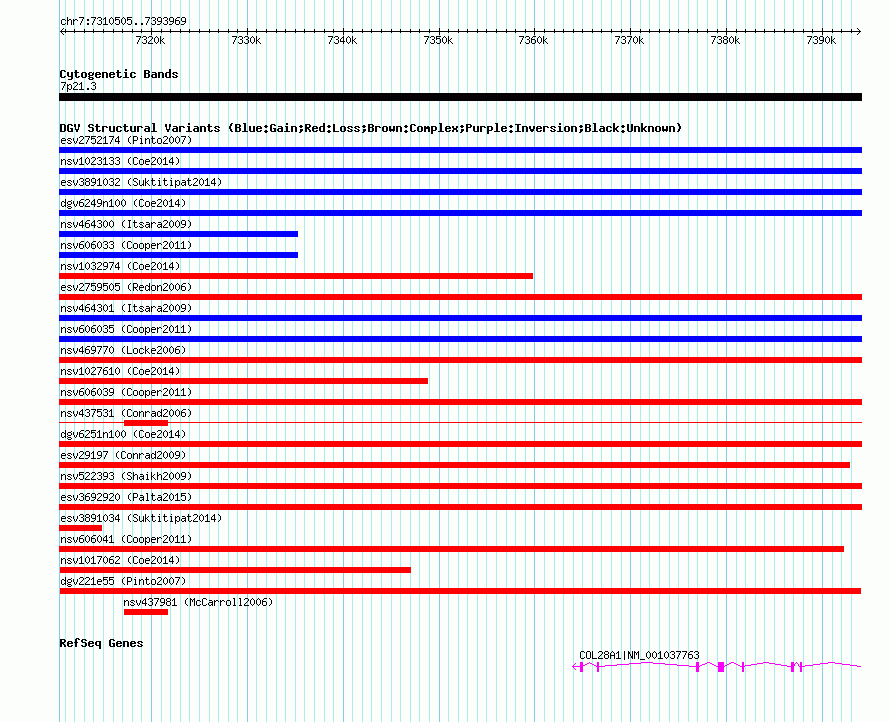 | | Variant Type | CNV loss | | Copy Number | | | Allele State | | | Allele Origin | | | Probe Count | | | Validation Flag | | | Merged Status | M | | Merged Variants | | | Supporting Variants | esv34490, esv34328 | | Samples | NA19099, NA19100 | | Known Genes | COL28A1 | | Method | SNP array | | Analysis | | | Platform | Affymetrix Mapping 250K Nsp SNP Array Affymetrix Mapping 250K Sty2 SNP Array | | Comments | | | Reference | Pinto_et_al_2007 | | Pubmed ID | 17911159 | | Accession Number(s) | dgv221e55