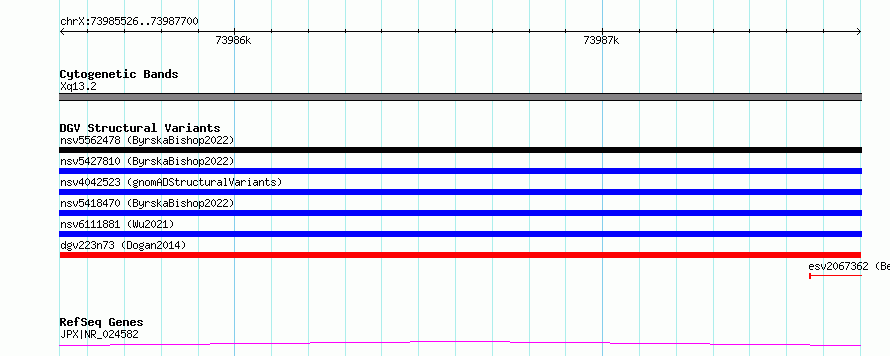 Variant DetailsVariant: dgv223n73| Internal ID | 22782829 | | Landmark | | | Location Information | | | Cytoband | Xq13.2 | | Allele length | | Assembly | Allele length | | hg38 | 2175 | | hg19 | 2175 |