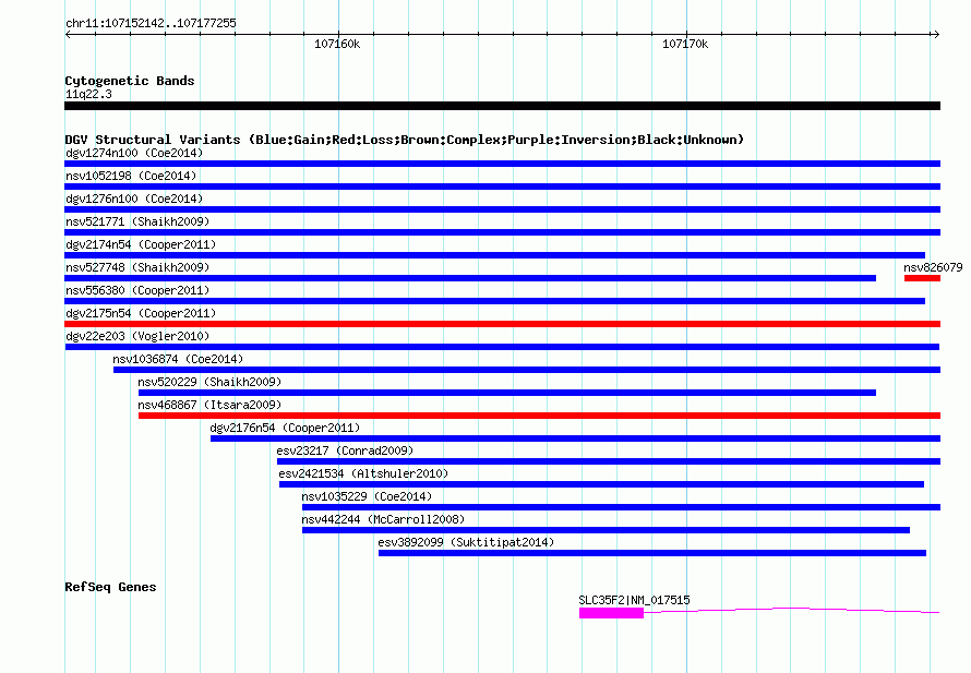 Variant DetailsVariant: dgv22e203| Internal ID | 22760718 | | Landmark | | | Location Information | | | Cytoband | 11q22.3 | | Allele length | | Assembly | Allele length | | hg38 | 25114 | | hg19 | 25114 | | hg18 | 25114 |