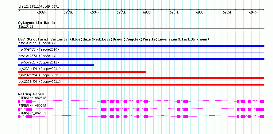 Variant DetailsVariant: dgv2326n54| Internal ID | 20135750 | | Landmark | | | Location Information | | | Cytoband | 12p13.31 | | Allele length | | Assembly | Allele length | | hg38 | 9265 | | hg19 | 9265 | | hg18 | 9265 |