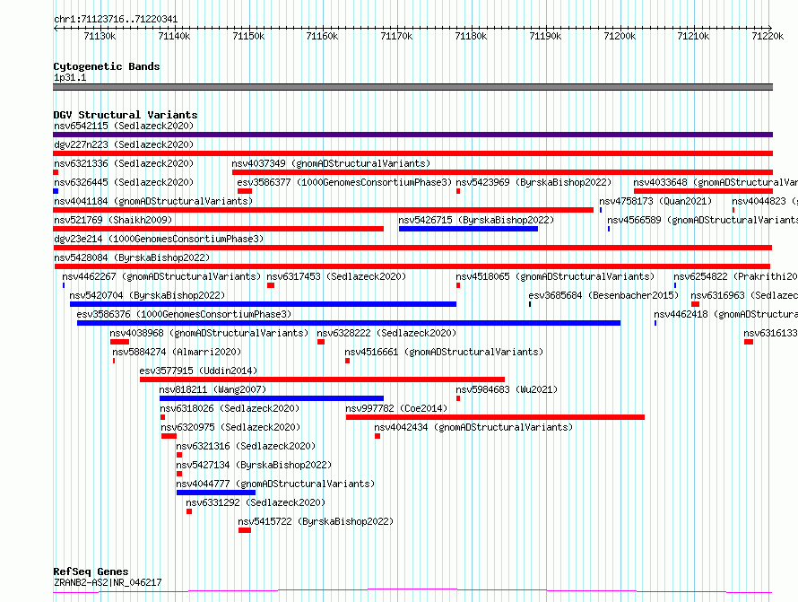 Variant DetailsVariant: dgv23e214| Internal ID | 22755917 | | Landmark | | | Location Information | | | Cytoband | 1p31.1 | | Allele length | | Assembly | Allele length | | hg38 | 96626 | | hg19 | 96626 |