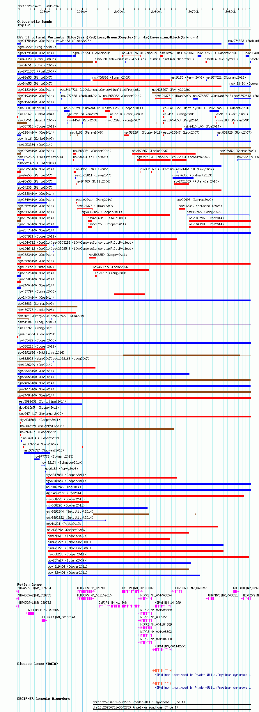 Variant DetailsVariant: dgv2405n100| Internal ID | 22788492 | | Landmark | | | Location Information | | | Cytoband | 15q11.2 | | Allele length | | Assembly | Allele length | | hg38 | 627347 | | hg19 | 627375 | | hg18 | 627452 |