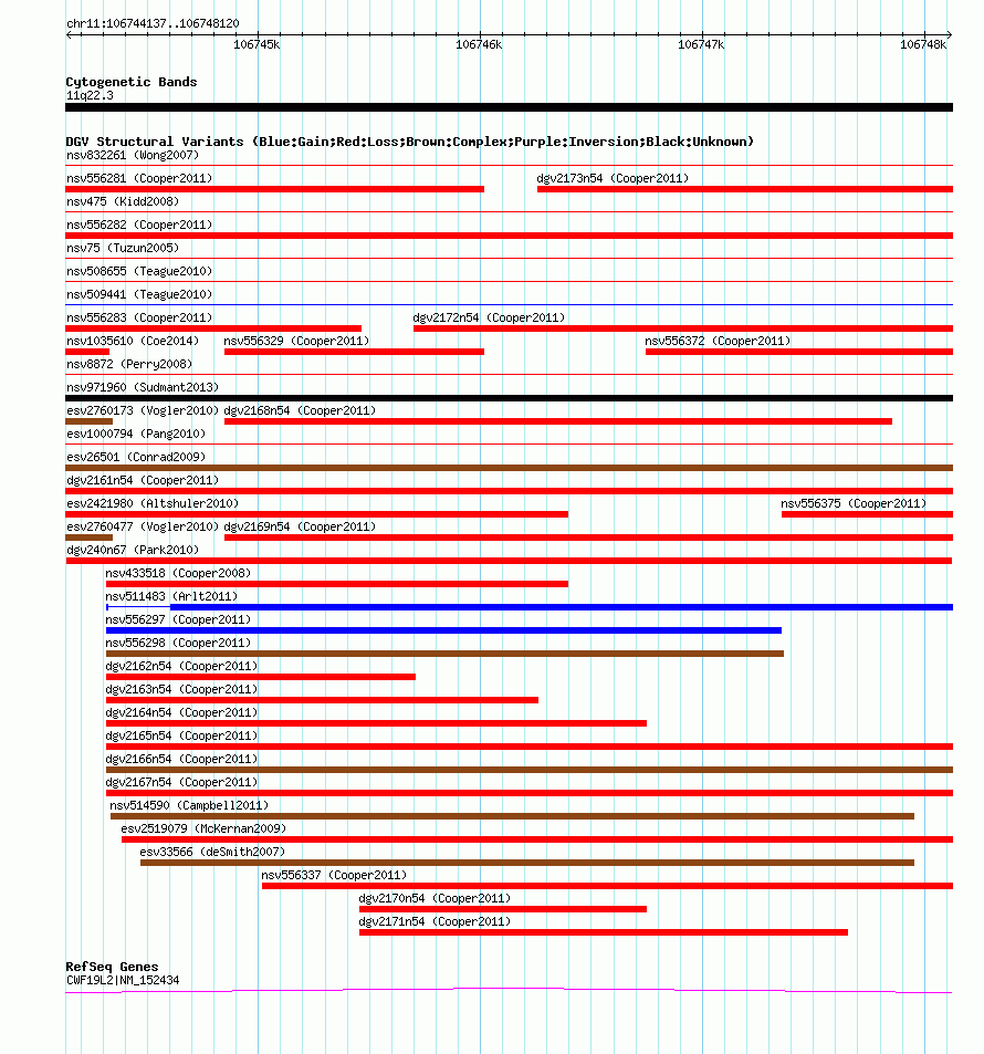 Variant DetailsVariant: dgv240n67 | Internal ID | 22781223 | | Landmark | | | Location Information | | | Cytoband | 11q22.3 | | Allele length | | Assembly | Allele length | | hg38 | 3984 | | hg19 | 3984 | | hg18 | 3984 |