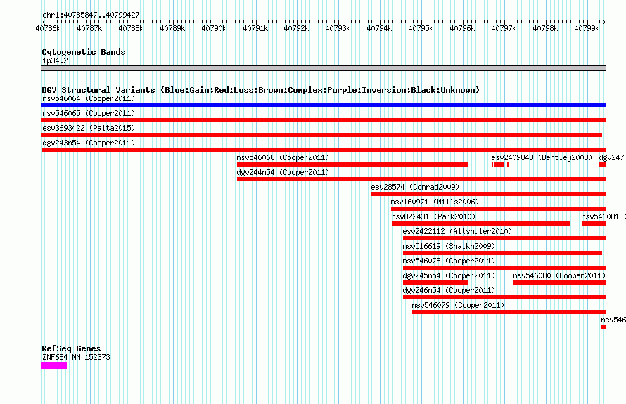 Variant DetailsVariant: dgv243n54| Internal ID | 22768138 | | Landmark | | | Location Information | | | Cytoband | 1p34.2 | | Allele length | | Assembly | Allele length | | hg38 | 13581 | | hg19 | 13581 | | hg18 | 13581 |