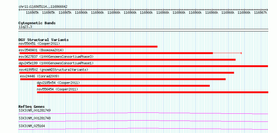 | | Variant Type | CNV deletion | | Copy Number | | | Allele State | | | Allele Origin | | | Probe Count | | | Validation Flag | | | Merged Status | M | | Merged Variants | | | Supporting Variants | esv2668806, esv2675319 | | Samples | NA07346, HG01168, NA20795, NA12348, NA20760, HG01334, HG00146, NA20773, HG00254, NA19780, HG01061 | | Known Genes | SIK3 | | Method | Merging | | Analysis | No reference, merging analysis | | Platform | Merging | | Comments | | | Reference | 1000_Genomes_Consortium_Phase_1 | | Pubmed ID | 23128226 | | Accession Number(s) | dgv245e199