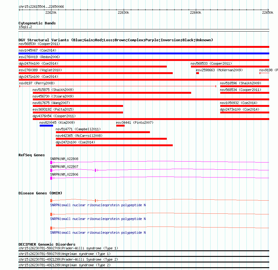 | | Variant Type | CNV loss | | Copy Number | | | Allele State | | | Allele Origin | | | Probe Count | | | Validation Flag | | | Merged Status | M | | Merged Variants | | | Supporting Variants | nsv1051660, nsv1040915 | | Samples | | | Known Genes | SNRPN | | Method | SNP array | | Analysis | Affymetrix SNP array copy number analysis | | Platform | Affymetrix SNP Array 6.0 | | Comments | | | Reference | Coe_et_al_2014 | | Pubmed ID | 25217958 | | Accession Number(s) | dgv2471n100