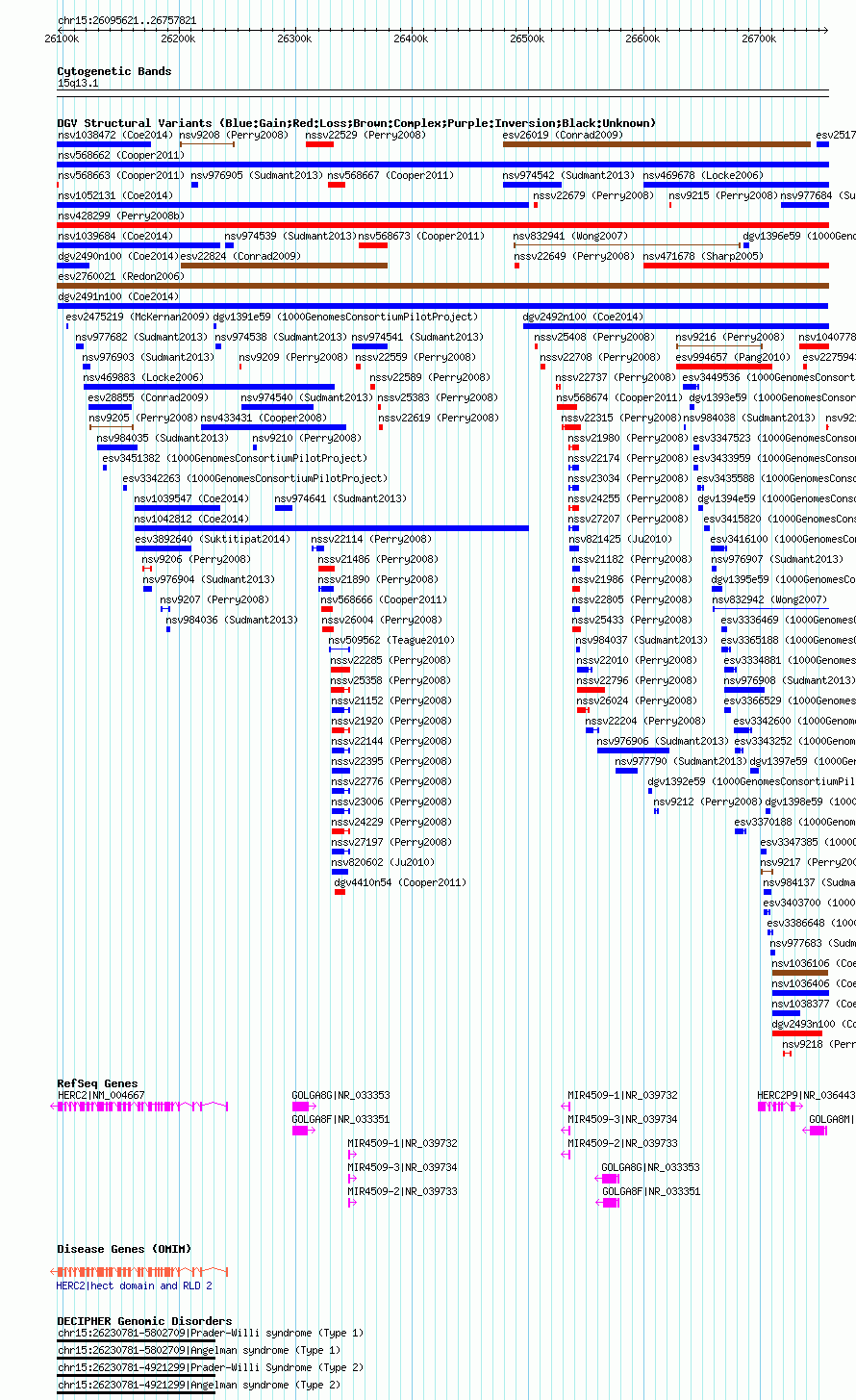 | | Variant Type | CNV gain | | Copy Number | | | Allele State | | | Allele Origin | | | Probe Count | | | Validation Flag | | | Merged Status | M | | Merged Variants | | | Supporting Variants | nsv1052642, nsv1044648 | | Samples | | | Known Genes | GOLGA8F, GOLGA8G, GOLGA8M, HERC2, HERC2P9, MIR4509-1, MIR4509-2, MIR4509-3 | | Method | SNP array | | Analysis | Affymetrix SNP array copy number analysis | | Platform | Affymetrix SNP Array 6.0 | | Comments | | | Reference | Coe_et_al_2014 | | Pubmed ID | 25217958 | | Accession Number(s) | dgv2491n100