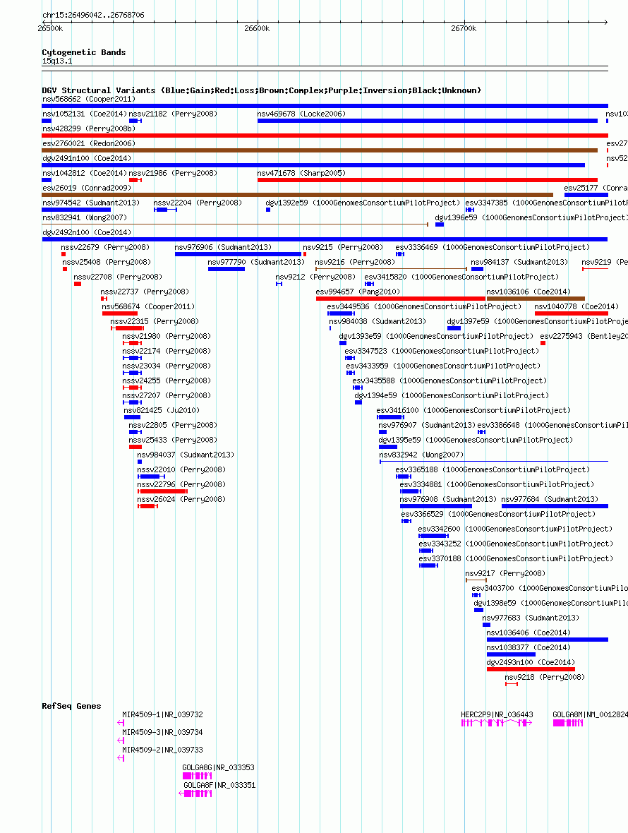 | | Variant Type | CNV gain | | Copy Number | | | Allele State | | | Allele Origin | | | Probe Count | | | Validation Flag | | | Merged Status | M | | Merged Variants | | | Supporting Variants | nsv1048161, nsv1042040 | | Samples | | | Known Genes | GOLGA8F, GOLGA8G, GOLGA8M, HERC2P9, MIR4509-1, MIR4509-2, MIR4509-3 | | Method | SNP array | | Analysis | Affymetrix SNP array copy number analysis | | Platform | Affymetrix SNP Array 6.0 | | Comments | | | Reference | Coe_et_al_2014 | | Pubmed ID | 25217958 | | Accession Number(s) | dgv2492n100