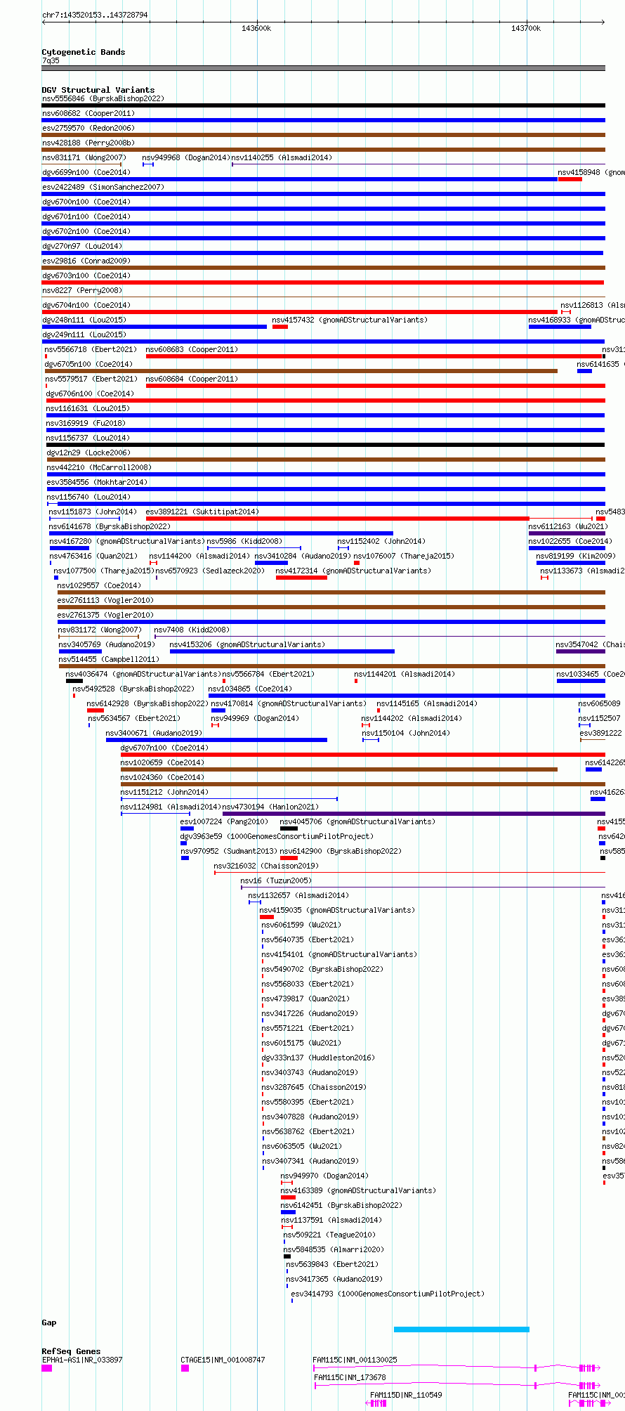 Variant DetailsVariant: dgv249n111| Internal ID | 22798449 | | Landmark | | | Location Information | | | Cytoband | 7q35 | | Allele length | | Assembly | Allele length | | hg38 | 208642 | | hg19 | 208642 |