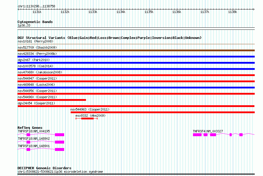 Variant DetailsVariant: dgv24n54| Internal ID | 20133448 | | Landmark | | | Location Information | | | Cytoband | 1p36.33 | | Allele length | | Assembly | Allele length | | hg38 | 8461 | | hg19 | 8461 | | hg18 | 8461 |