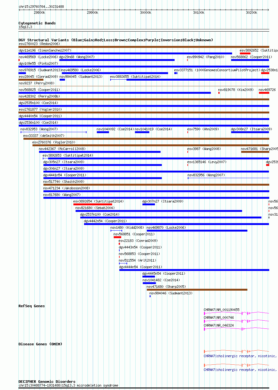 Variant DetailsVariant: dgv2536n100| Internal ID | 22788623 | | Landmark | | | Location Information | | | Cytoband | 15q13.3 | | Allele length | | Assembly | Allele length | | hg38 | 470727 | | hg19 | 470725 | | hg18 | 470725 |