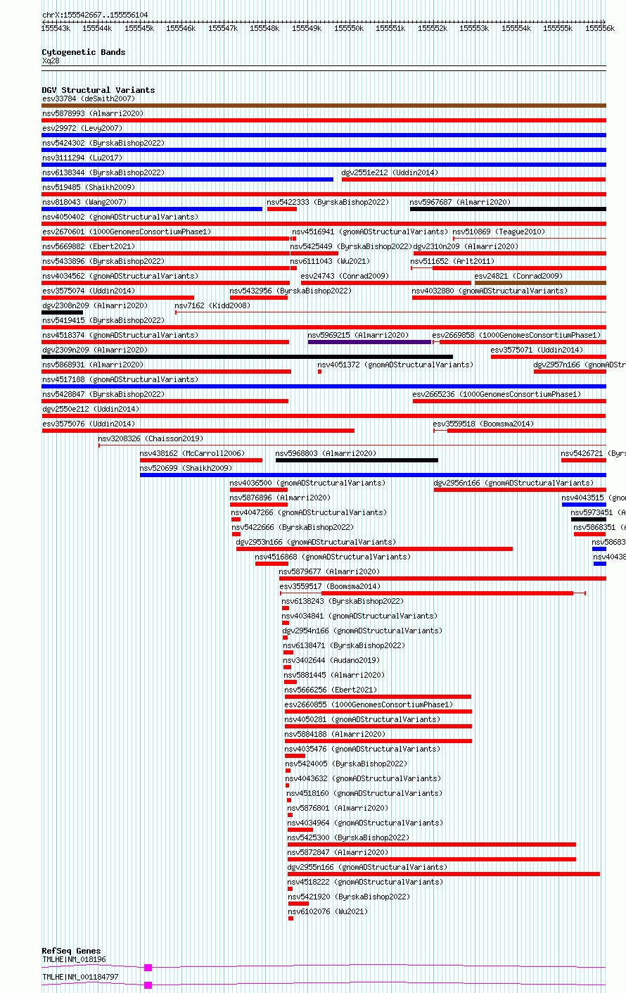 Variant DetailsVariant: dgv2550e212| Internal ID | 22785477 | | Landmark | | | Location Information | | | Cytoband | Xq28 | | Allele length | | Assembly | Allele length | | hg38 | 13438 | | hg19 | 13438 |