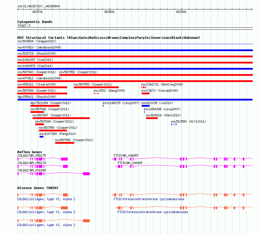 | | Variant Type | CNV gain | | Copy Number | | | Allele State | | | Allele Origin | | | Probe Count | | | Validation Flag | | | Merged Status | M | | Merged Variants | | | Supporting Variants | nsv527953, nsv517870 | | Samples | | | Known Genes | COL6A2, FTCD | | Method | SNP array | | Analysis | Sample-level CNVs | | Platform | GPL6434 | | Comments | | | Reference | Shaikh_et_al_2009 | | Pubmed ID | 19592680 | | Accession Number(s) | dgv255n21