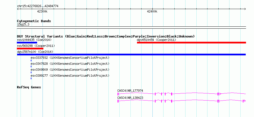 | | Variant Type | CNV gain | | Copy Number | | | Allele State | | | Allele Origin | | | Probe Count | | | Validation Flag | | | Merged Status | M | | Merged Variants | | | Supporting Variants | nsv1035386, nsv1044686 | | Samples | | | Known Genes | CASC4 | | Method | SNP array | | Analysis | Affymetrix SNP array copy number analysis | | Platform | Affymetrix SNP Array 6.0 | | Comments | | | Reference | Coe_et_al_2014 | | Pubmed ID | 25217958 | | Accession Number(s) | dgv2587n100