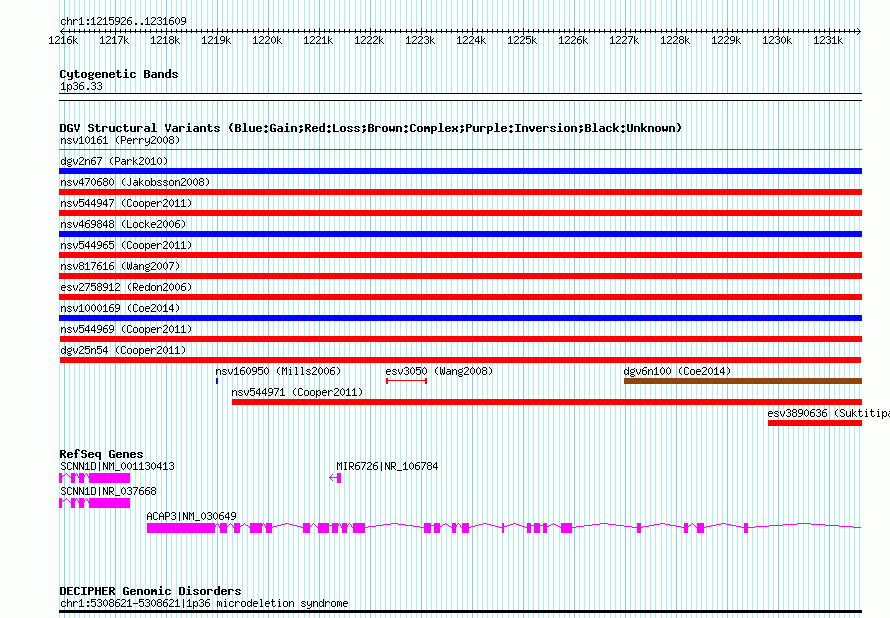 | | Variant Type | CNV loss | | Copy Number | | | Allele State | | | Allele Origin | | | Probe Count | | | Validation Flag | | | Merged Status | M | | Merged Variants | | | Supporting Variants | nsv544970, nsv544967, nsv544968 | | Samples | | | Known Genes | ACAP3, MIR6726, SCNN1D | | Method | SNP array | | Analysis | Illumina SNP array copy number analysis | | Platform | Not reported | | Comments | | | Reference | Cooper_et_al_2011 | | Pubmed ID | 21841781 | | Accession Number(s) | dgv25n54