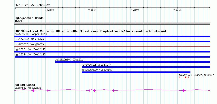 | | Variant Type | CNV gain | | Copy Number | | | Allele State | | | Allele Origin | | | Probe Count | | | Validation Flag | | | Merged Status | M | | Merged Variants | | | Supporting Variants | nsv1043026, nsv1054300, nsv1046448, nsv1035389, nsv1041435, nsv1044603, nsv1046099 | | Samples | | | Known Genes | C15orf27 | | Method | SNP array | | Analysis | Affymetrix SNP array copy number analysis | | Platform | Affymetrix SNP Array 6.0 | | Comments | | | Reference | Coe_et_al_2014 | | Pubmed ID | 25217958 | | Accession Number(s) | dgv2624n100