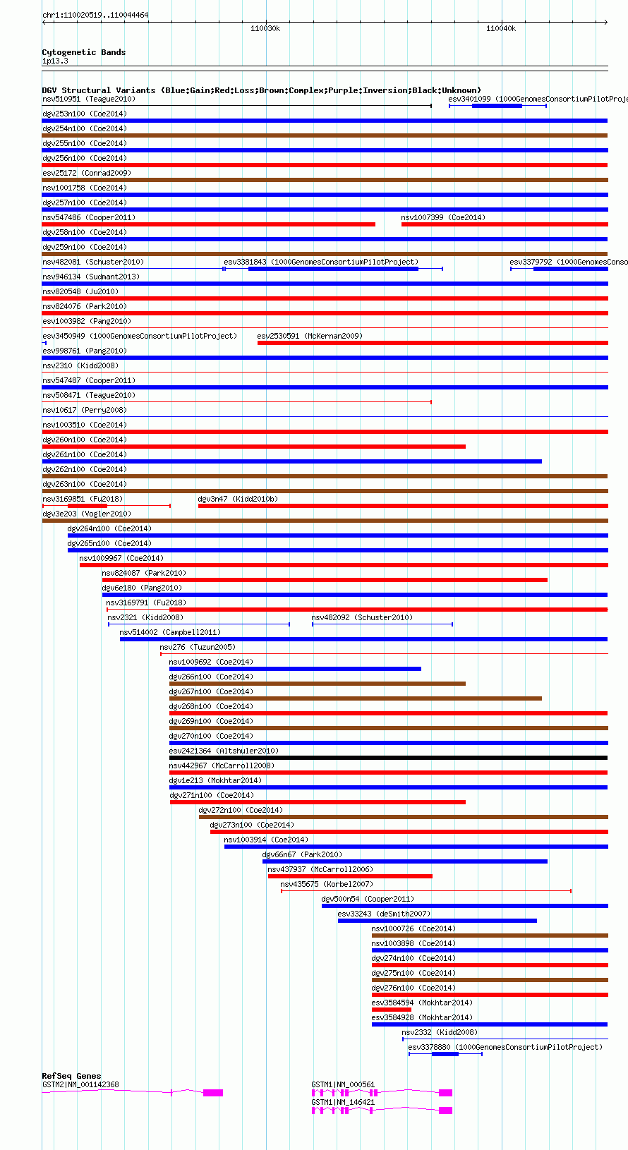 | | Variant Type | CNV gain+loss | | Copy Number | | | Allele State | | | Allele Origin | | | Probe Count | | | Validation Flag | | | Merged Status | M | | Merged Variants | | | Supporting Variants | nsv1000327, nsv1002675, nsv1005106, nsv1002052, nsv1013959, nsv1005063, nsv1001067 | | Samples | | | Known Genes | GSTM1, GSTM2 | | Method | SNP array | | Analysis | Affymetrix SNP array copy number analysis | | Platform | Affymetrix SNP Array 6.0 | | Comments | | | Reference | Coe_et_al_2014 | | Pubmed ID | 25217958 | | Accession Number(s) | dgv262n100