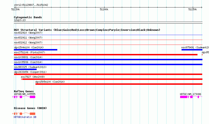 | | Variant Type | CNV loss | | Copy Number | | | Allele State | | | Allele Origin | | | Probe Count | | | Validation Flag | | | Merged Status | M | | Merged Variants | | | Supporting Variants | nsv558929, nsv558932, nsv558930, nsv558931 | | Samples | | | Known Genes | KRT6B, KRT6C | | Method | SNP array | | Analysis | Illumina SNP array copy number analysis | | Platform | Not reported | | Comments | | | Reference | Cooper_et_al_2011 | | Pubmed ID | 21841781 | | Accession Number(s) | dgv2633n54