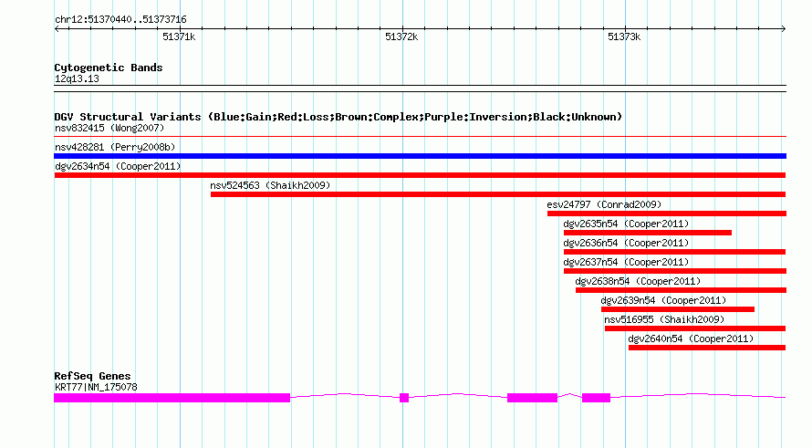 |  | Variant Type | CNV loss |  | Copy Number |  |  | Allele State |  |  | Allele Origin |  |  | Probe Count |  |  | Validation Flag |  |  | Merged Status | M |  | Merged Variants |  |  | Supporting Variants | nsv558934, nsv558935 |  | Samples |  |  | Known Genes | KRT77 |  | Method | SNP array |  | Analysis | Illumina SNP array copy number analysis |  | Platform | Not reported |  | Comments |  |  | Reference | Cooper_et_al_2011 |  | Pubmed ID | 21841781 |  | Accession Number(s) | dgv2634n54