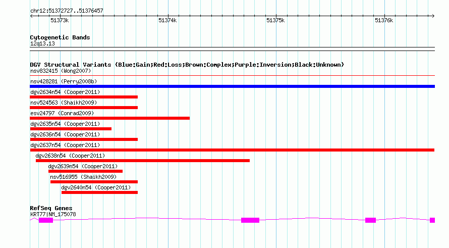 Variant DetailsVariant: dgv2637n54| Internal ID | 22770532 | | Landmark | | | Location Information | | | Cytoband | 12q13.13 | | Allele length | | Assembly | Allele length | | hg38 | 3731 | | hg19 | 3731 | | hg18 | 3731 |