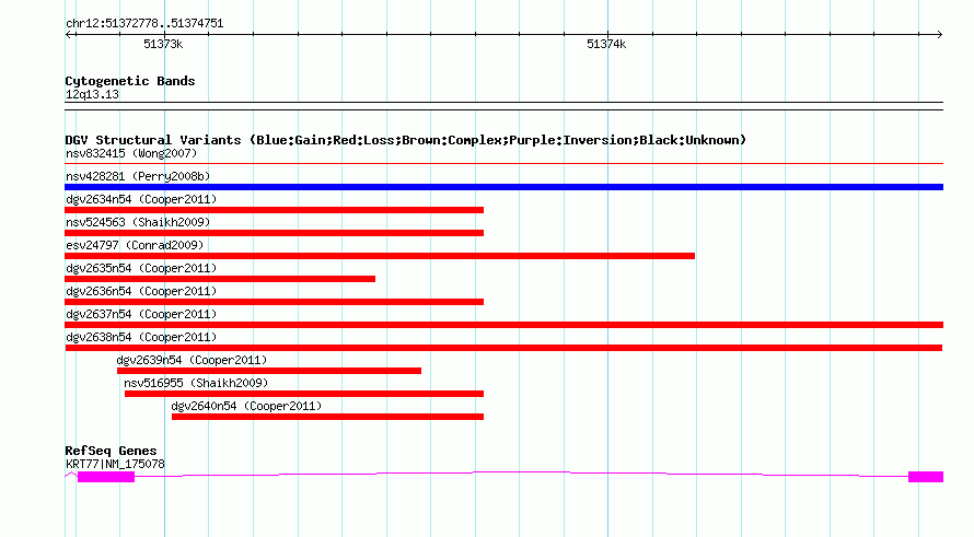 Variant DetailsVariant: dgv2638n54| Internal ID | 22770533 | | Landmark | | | Location Information | | | Cytoband | 12q13.13 | | Allele length | | Assembly | Allele length | | hg38 | 1974 | | hg19 | 1974 | | hg18 | 1974 |