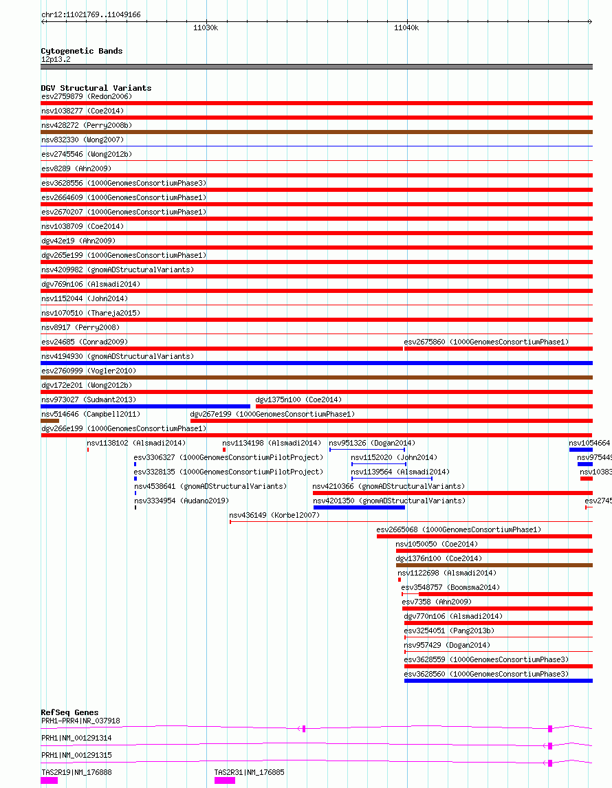 Variant DetailsVariant: dgv266e199| Internal ID | 20123568 | | Landmark | | | Location Information | | | Cytoband | 12p13.2 | | Allele length | | Assembly | Allele length | | hg38 | 27398 | | hg19 | 27398 |
