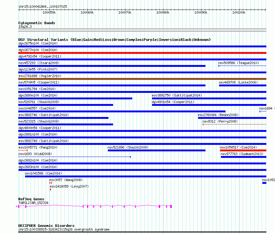 Variant DetailsVariant: dgv2682n100| Internal ID | 22788769 | | Landmark | | | Location Information | | | Cytoband | 15q26.3 | | Allele length | | Assembly | Allele length | | hg38 | 65162 | | hg19 | 65162 | | hg18 | 65162 |
