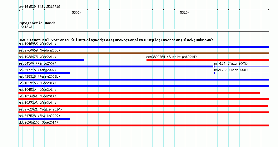 Variant DetailsVariant: dgv2698n100| Internal ID | 20154314 | | Landmark | | | Location Information | | | Cytoband | 16p13.3 | | Allele length | | Assembly | Allele length | | hg38 | 23077 | | hg19 | 23077 | | hg18 | 23077 |