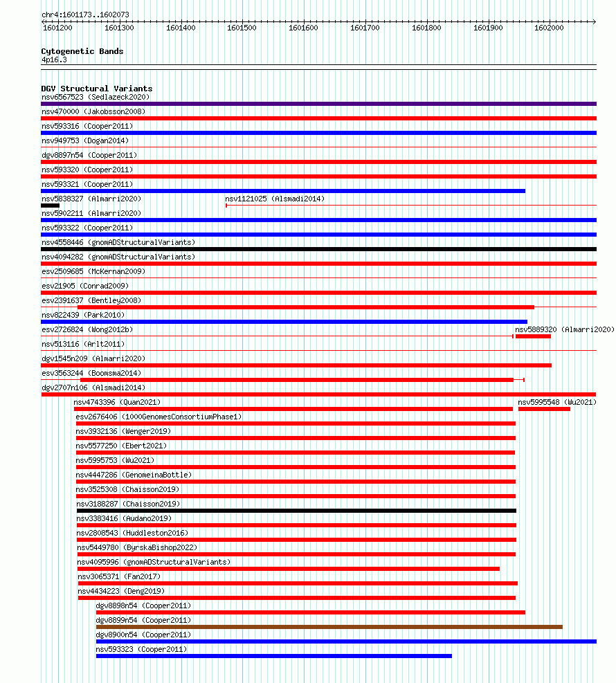 Variant DetailsVariant: dgv2707n106| Internal ID | 22796535 | | Landmark | | | Location Information | | | Cytoband | 4p16.3 | | Allele length | | Assembly | Allele length | | hg38 | 901 | | hg19 | 901 |