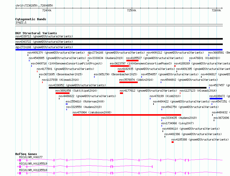 Variant DetailsVariant: dgv272n166 Internal ID | 20165700 | Landmark | | Location Information | | Cytoband | 10q22.1 | Allele length | Assembly | Allele length | hg38 | 244201 | hg19 | 244201 |