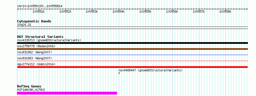 | Variant Type | CNV loss | Copy Number | | Allele State | | Allele Origin | | Probe Count | | Validation Flag | | Merged Status | M | Merged Variants | | Supporting Variants | esv3579091, esv3579092 | Samples | 400889CM, 401368WR, 400032RC, 400508RD | Known Genes | HIF1AN | Method | SNP array | Analysis | We used four separate algorithms to detect CNVs; Affymetrix Chromosome Analysis Suite (ChAS), iPattern, Nexus and Partek. Our primary analysis was performed based on ChAS CNV calls, which were then supported using the remaining three algorithms to construct a confidence set of CNVs. For all algorithms, we have used 8 probes and >1kb as a base line cutoff for CNV detection. | Platform | Affymetrix CytoScan HD 2.7M array | Comments | | Reference | Uddin_et_al_2014 | Pubmed ID | 25503493 | Accession Number(s) | dgv277e212