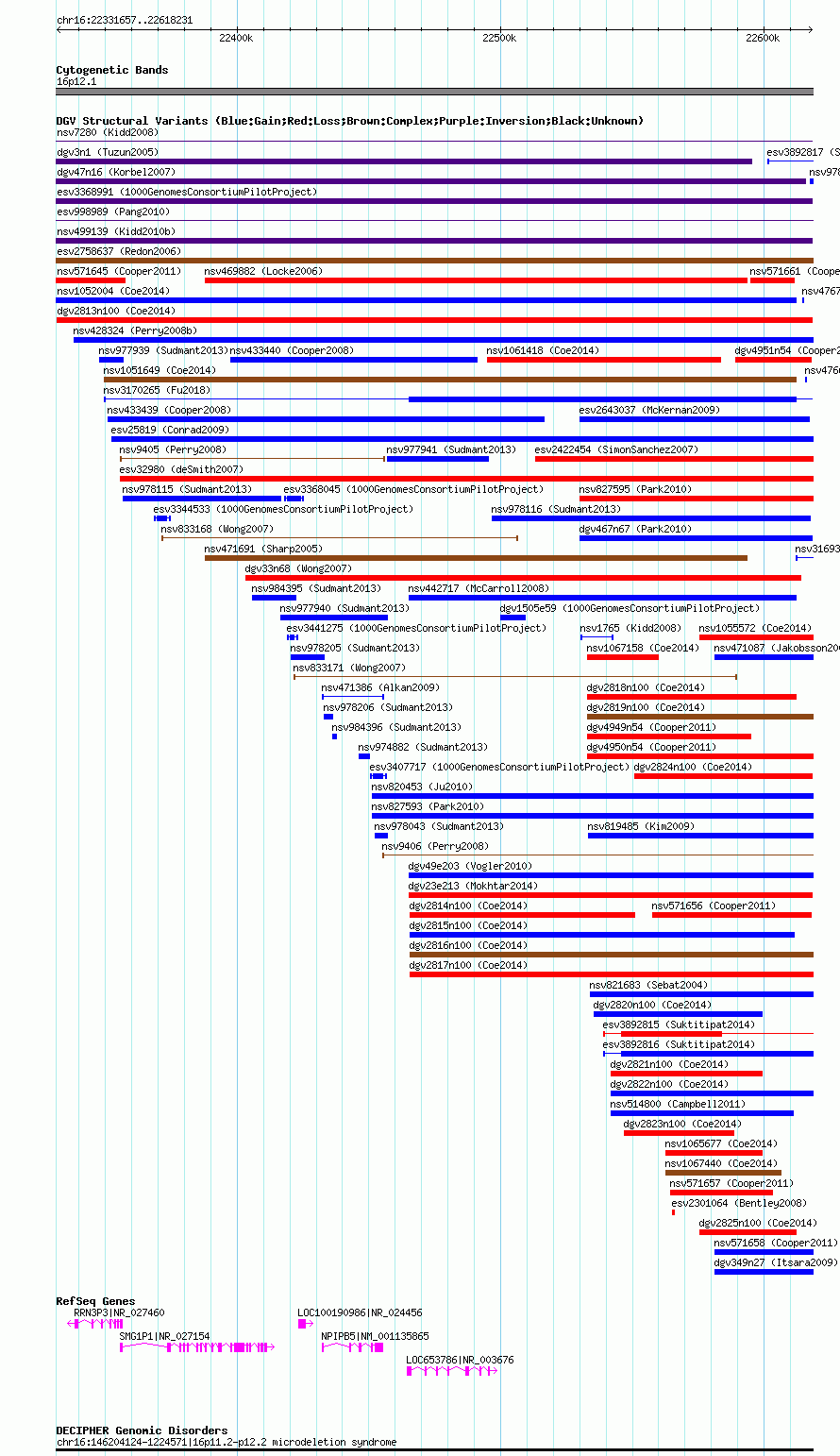 Variant DetailsVariant: dgv2813n100| Internal ID | 22788900 | | Landmark | | | Location Information | | | Cytoband | 16p12.1 | | Allele length | | Assembly | Allele length | | hg38 | 286575 | | hg19 | 286575 | | hg18 | 286575 |