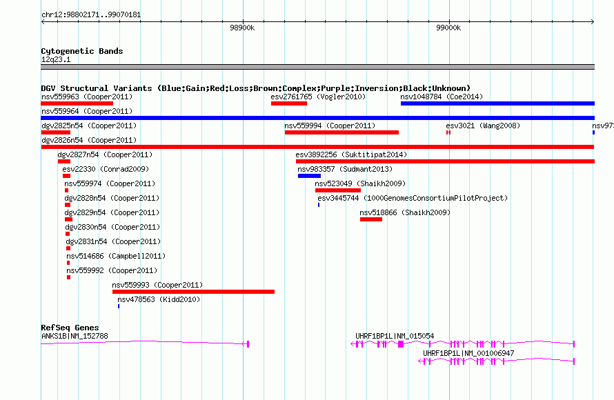 | Variant Type | CNV loss | Copy Number | | Allele State | | Allele Origin | | Probe Count | | Validation Flag | | Merged Status | M | Merged Variants | | Supporting Variants | nsv559970, nsv559966 | Samples | | Known Genes | ANKS1B, UHRF1BP1L | Method | SNP array | Analysis | Illumina SNP array copy number analysis | Platform | Not reported | Comments | | Reference | Cooper_et_al_2011 | Pubmed ID | 21841781 | Accession Number(s) | dgv2826n54