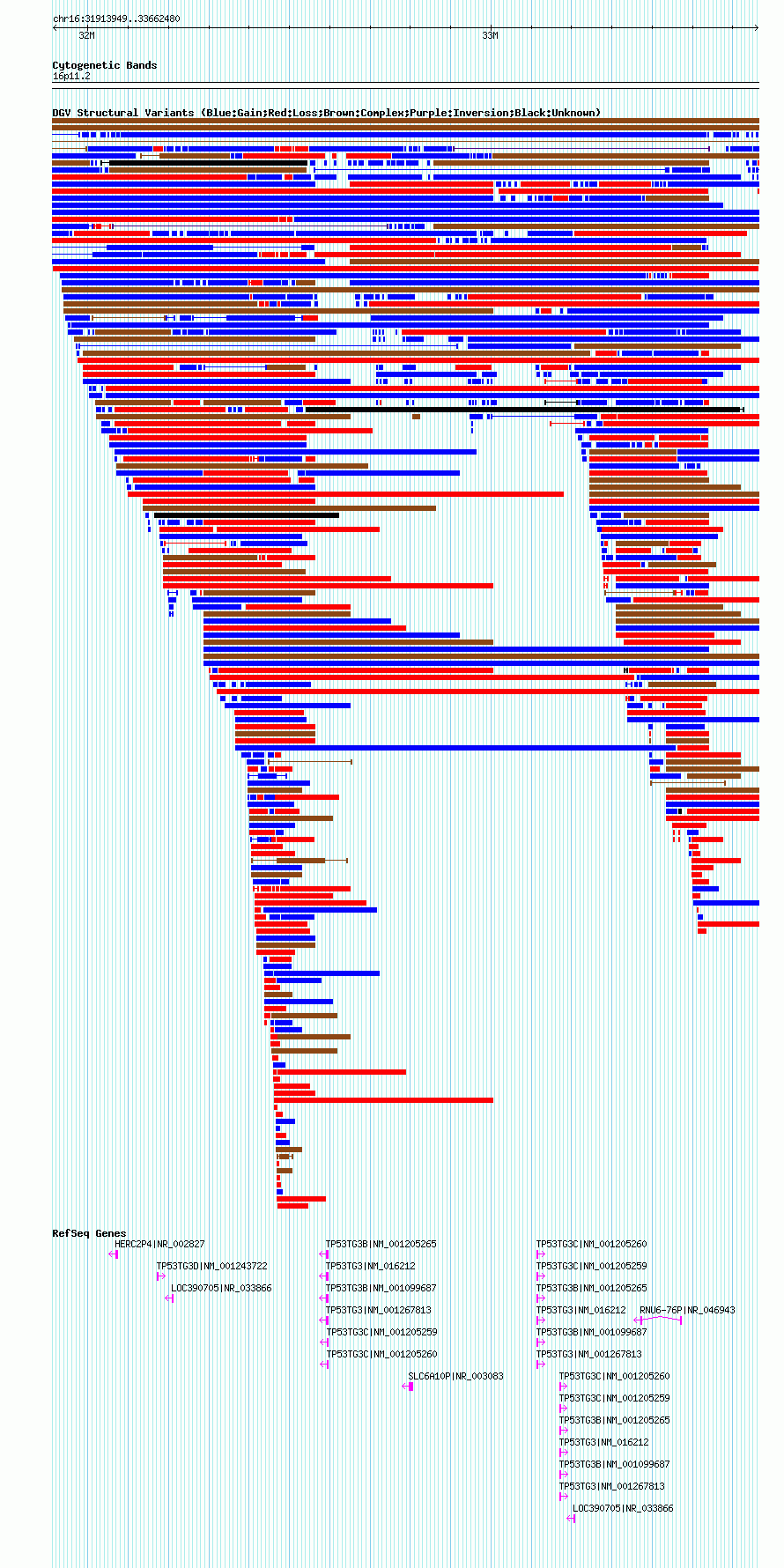 | | Variant Type | CNV loss | | Copy Number | | | Allele State | | | Allele Origin | | | Probe Count | | | Validation Flag | | | Merged Status | M | | Merged Variants | | | Supporting Variants | nsv1064113, nsv1056226, nsv1066362, nsv1065239, nsv1057666, nsv1066771, nsv1064520, nsv1061966, nsv1058908, nsv1058205, nsv1056375, nsv1058082, nsv1061664, nsv1055445, nsv1060775, nsv1056688, nsv1058865, nsv1056017, nsv1059438 | | Samples | | | Known Genes | HERC2P4, LOC390705, RNU6-76P, SLC6A10P, TP53TG3, TP53TG3B, TP53TG3C, TP53TG3D | | Method | SNP array | | Analysis | Affymetrix SNP array copy number analysis | | Platform | Affymetrix SNP Array 6.0 | | Comments | | | Reference | Coe_et_al_2014 | | Pubmed ID | 25217958 | | Accession Number(s) | dgv2842n100