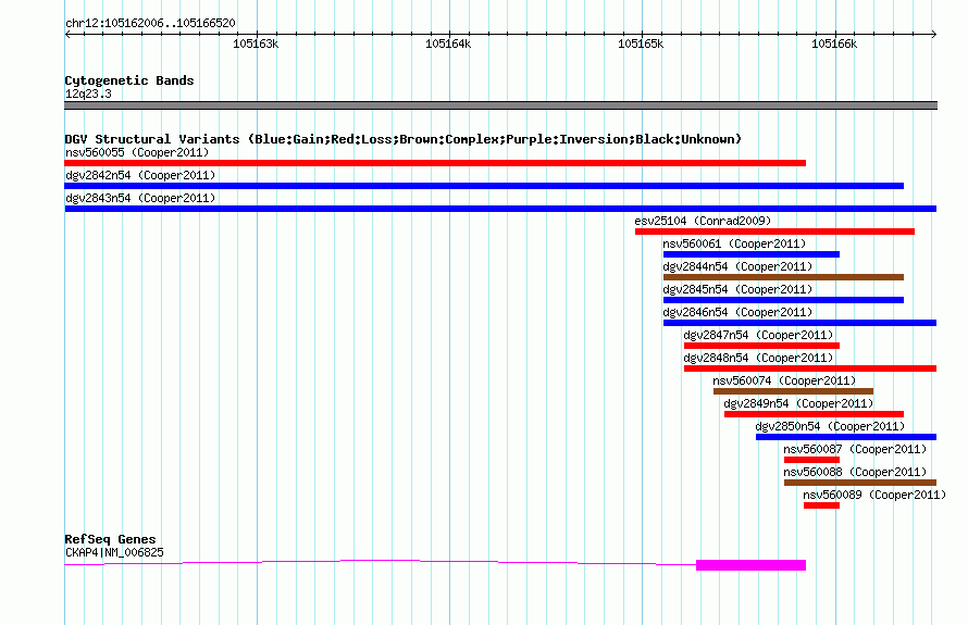| | Variant Type | CNV gain | | Copy Number | | | Allele State | | | Allele Origin | | | Probe Count | | | Validation Flag | | | Merged Status | M | | Merged Variants | | | Supporting Variants | nsv560060, nsv560059 | | Samples | | | Known Genes | CKAP4 | | Method | SNP array | | Analysis | Illumina SNP array copy number analysis | | Platform | Not reported | | Comments | | | Reference | Cooper_et_al_2011 | | Pubmed ID | 21841781 | | Accession Number(s) | dgv2843n54