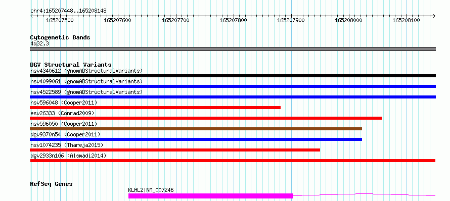 | | Variant Type | CNV deletion | | Copy Number | | | Allele State | | | Allele Origin | | | Probe Count | | | Validation Flag | | | Merged Status | M | | Merged Variants | | | Supporting Variants | nsv1126702, nsv1133589 | | Samples | KWS2, KWS1 | | Known Genes | KLHL2 | | Method | Sequencing | | Analysis | HugeSeq | | Platform | Illumina HiSeq 2000 | | Comments | | | Reference | Alsmadi_et_al_2014 | | Pubmed ID | 24896259 | | Accession Number(s) | dgv2933n106