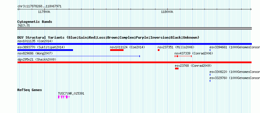 | Variant Type | CNV loss | Copy Number | | Allele State | | Allele Origin | | Probe Count | | Validation Flag | | Merged Status | M | Merged Variants | | Supporting Variants | nsv524961, nsv521250 | Samples | | Known Genes | TUSC7 | Method | SNP array | Analysis | Sample-level CNVs | Platform | GPL6434 | Comments | | Reference | Shaikh_et_al_2009 | Pubmed ID | 19592680 | Accession Number(s) | dgv295n21