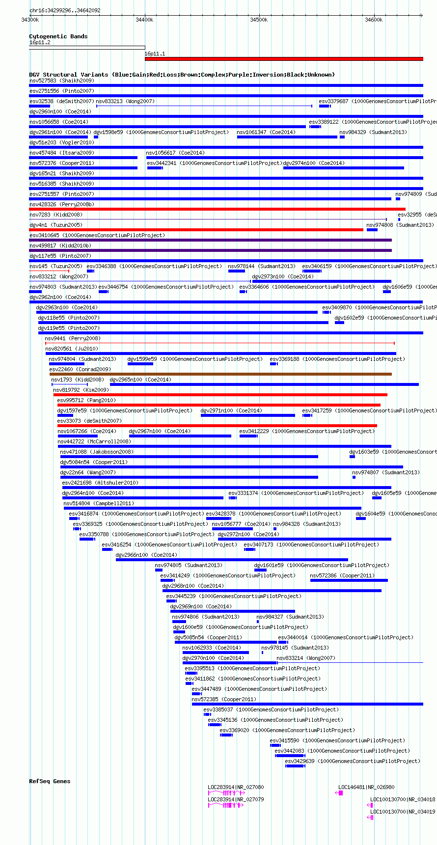 Variant DetailsVariant: dgv2962n100 | Internal ID | 22789049 | | Landmark | | | Location Information | | | Cytoband | 16p11.1 | | Allele length | | Assembly | Allele length | | hg38 | 342797 | | hg19 | 342797 | | hg18 | 342797 |