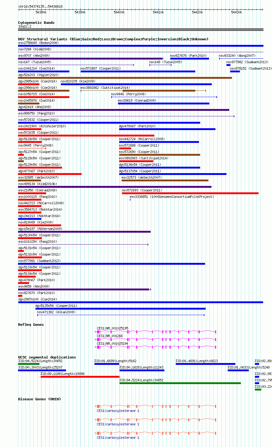 | | Variant Type | CNV gain | | Copy Number | | | Allele State | | | Allele Origin | | | Probe Count | | | Validation Flag | | | Merged Status | M | | Merged Variants | | | Supporting Variants | nsv1061523, nsv1056719 | | Samples | | | Known Genes | CES1 | | Method | SNP array | | Analysis | Affymetrix SNP array copy number analysis | | Platform | Affymetrix SNP Array 6.0 | | Comments | | | Reference | Coe_et_al_2014 | | Pubmed ID | 25217958 | | Accession Number(s) | dgv2987n100