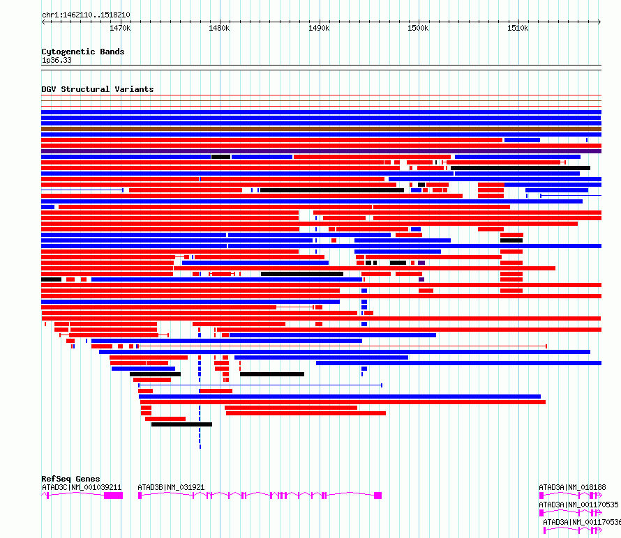 Variant DetailsVariant: dgv2e212 | Internal ID | 22782929 | | Landmark | | | Location Information | | | Cytoband | 1p36.33 | | Allele length | | Assembly | Allele length | | hg38 | 56101 | | hg19 | 56101 |
