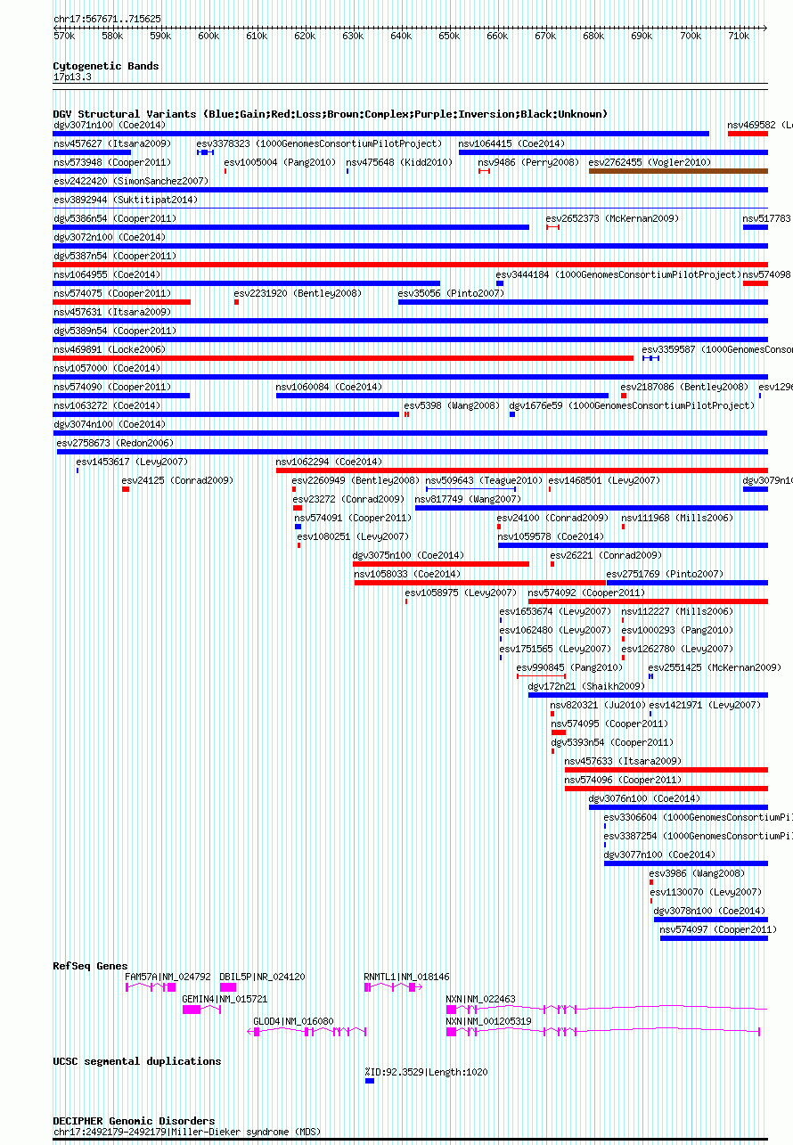 Variant DetailsVariant: dgv3074n100| Internal ID | 20154690 | | Landmark | | | Location Information | | | Cytoband | 17p13.3 | | Allele length | | Assembly | Allele length | | hg38 | 147955 | | hg19 | 147955 | | hg18 | 147955 |