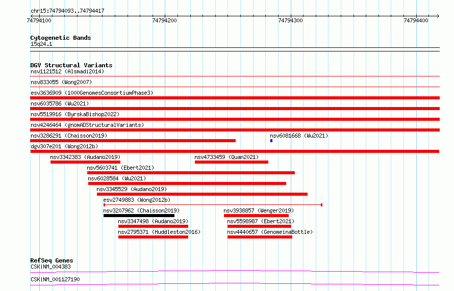 Variant DetailsVariant: dgv307e201| Internal ID | 22759665 | | Landmark | | | Location Information | | | Cytoband | 15q24.1 | | Allele length | | Assembly | Allele length | | hg38 | 325 | | hg19 | 325 |