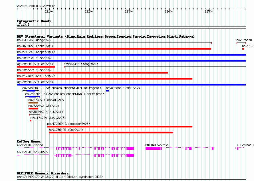 | Variant Type | CNV gain | Copy Number | | Allele State | | Allele Origin | | Probe Count | | Validation Flag | | Merged Status | M | Merged Variants | | Supporting Variants | nsv1063834, nsv1059182 | Samples | | Known Genes | LOC284009, MNT, SGSM2 | Method | SNP array | Analysis | Affymetrix SNP array copy number analysis | Platform | Affymetrix SNP Array 6.0 | Comments | | Reference | Coe_et_al_2014 | Pubmed ID | 25217958 | Accession Number(s) | dgv3083n100