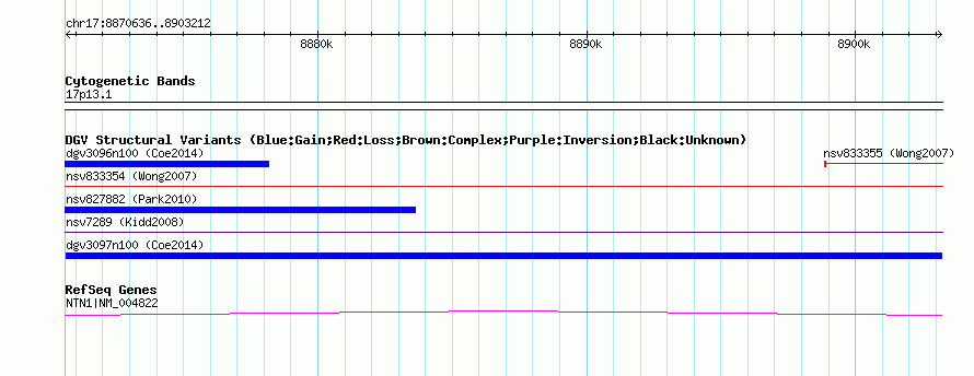 Variant DetailsVariant: dgv3097n100| Internal ID | 22789184 | | Landmark | | | Location Information | | | Cytoband | 17p13.1 | | Allele length | | Assembly | Allele length | | hg38 | 32577 | | hg19 | 32577 | | hg18 | 32577 |
