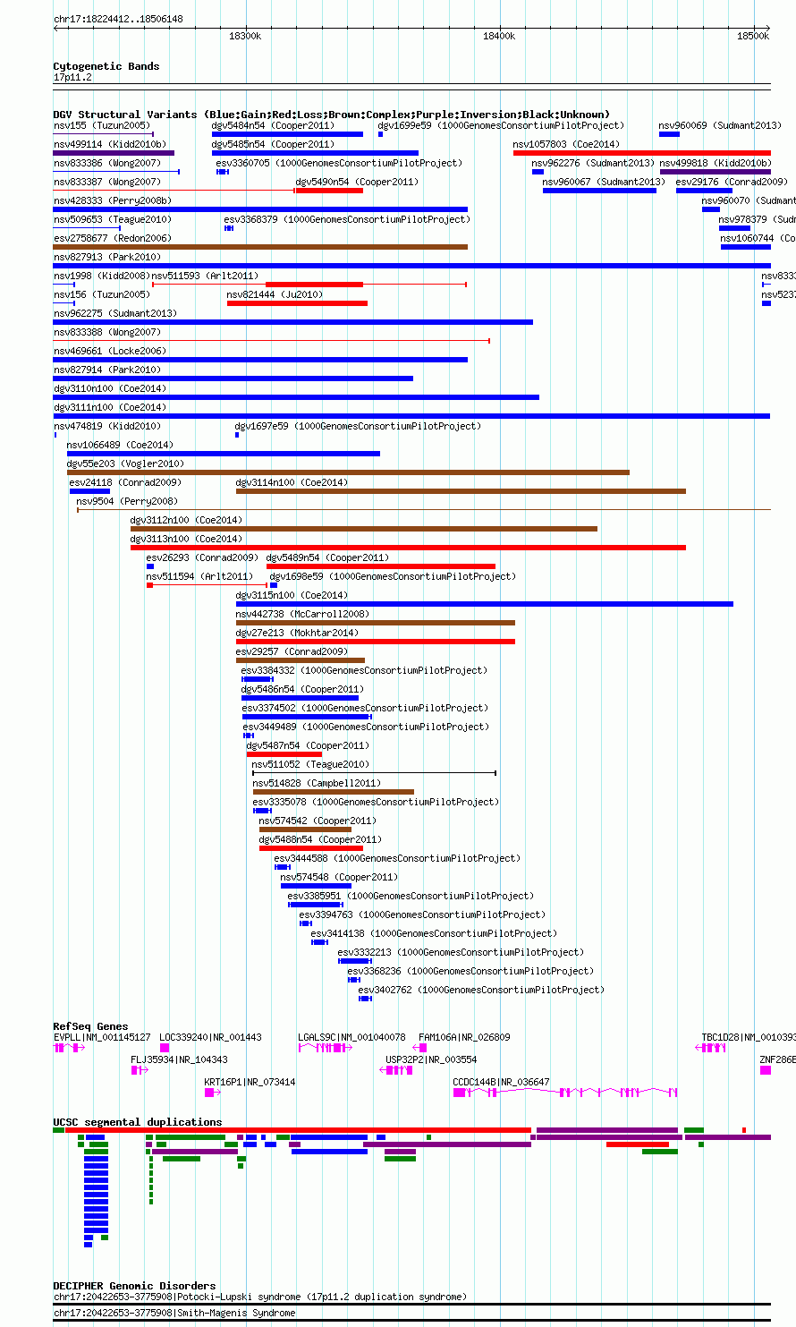 Variant DetailsVariant: dgv3111n100| Internal ID | 20154727 | | Landmark | | | Location Information | | | Cytoband | 17p11.2 | | Allele length | | Assembly | Allele length | | hg38 | 281738 | | hg19 | 281737 | | hg18 | 281737 |