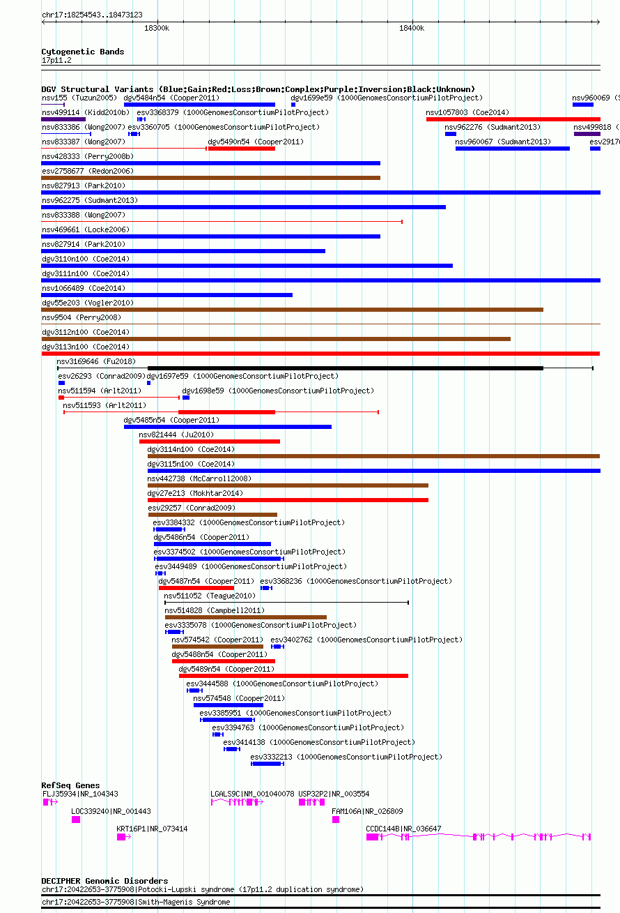 Variant DetailsVariant: dgv3113n100| Internal ID | 22789200 | | Landmark | | | Location Information | | | Cytoband | 17p11.2 | | Allele length | | Assembly | Allele length | | hg38 | 218582 | | hg19 | 218581 | | hg18 | 218581 |