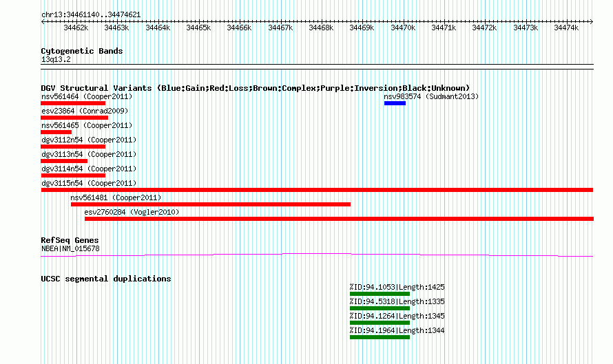 | | Variant Type | CNV loss | | Copy Number | | | Allele State | | | Allele Origin | | | Probe Count | | | Validation Flag | | | Merged Status | M | | Merged Variants | | | Supporting Variants | nsv561478, nsv561480 | | Samples | | | Known Genes | NBEA | | Method | SNP array | | Analysis | Illumina SNP array copy number analysis | | Platform | Not reported | | Comments | | | Reference | Cooper_et_al_2011 | | Pubmed ID | 21841781 | | Accession Number(s) | dgv3115n54