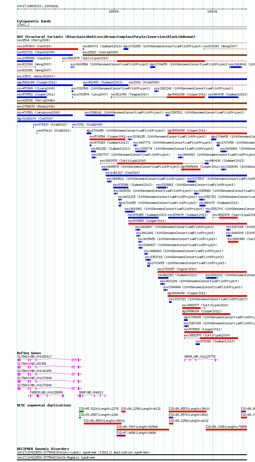 Variant DetailsVariant: dgv3116n100| Internal ID | 20154732 | | Landmark | | | Location Information | | | Cytoband | 17p11.2 | | Allele length | | Assembly | Allele length | | hg38 | 232251 | | hg19 | 232251 | | hg18 | 232119 |